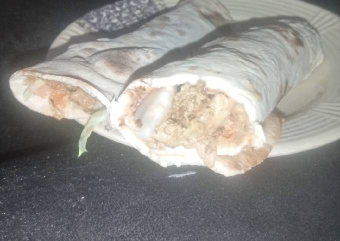 - Take one shawarma bread, spread the mayo ketchup paste on it. Put the toppings (salad and cooked chicken), and roll it. Repeat this process for the remaining breads..